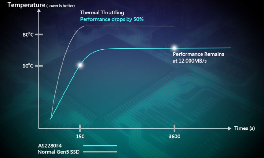AS2280F4, fansız Gen5 SSD'lerde sıklıkla görülen aşırı ısınma sorunlarının üstesinden etkili bir şekilde gelir. Uzun süreler boyunca sıralı okuma hızlarında etkileyici 12.000 MB/s'yi sürdürmek gibi ağır iş yükleri altında bile sürekli olarak değişmez bir performans sunarak kullanıcı üretkenliğini benzeri görülmemiş seviyelere çıkarır.